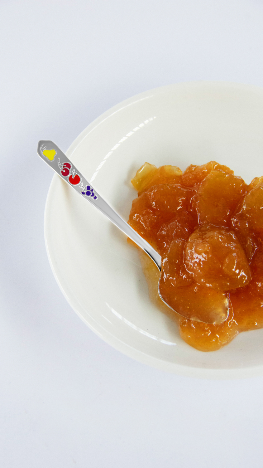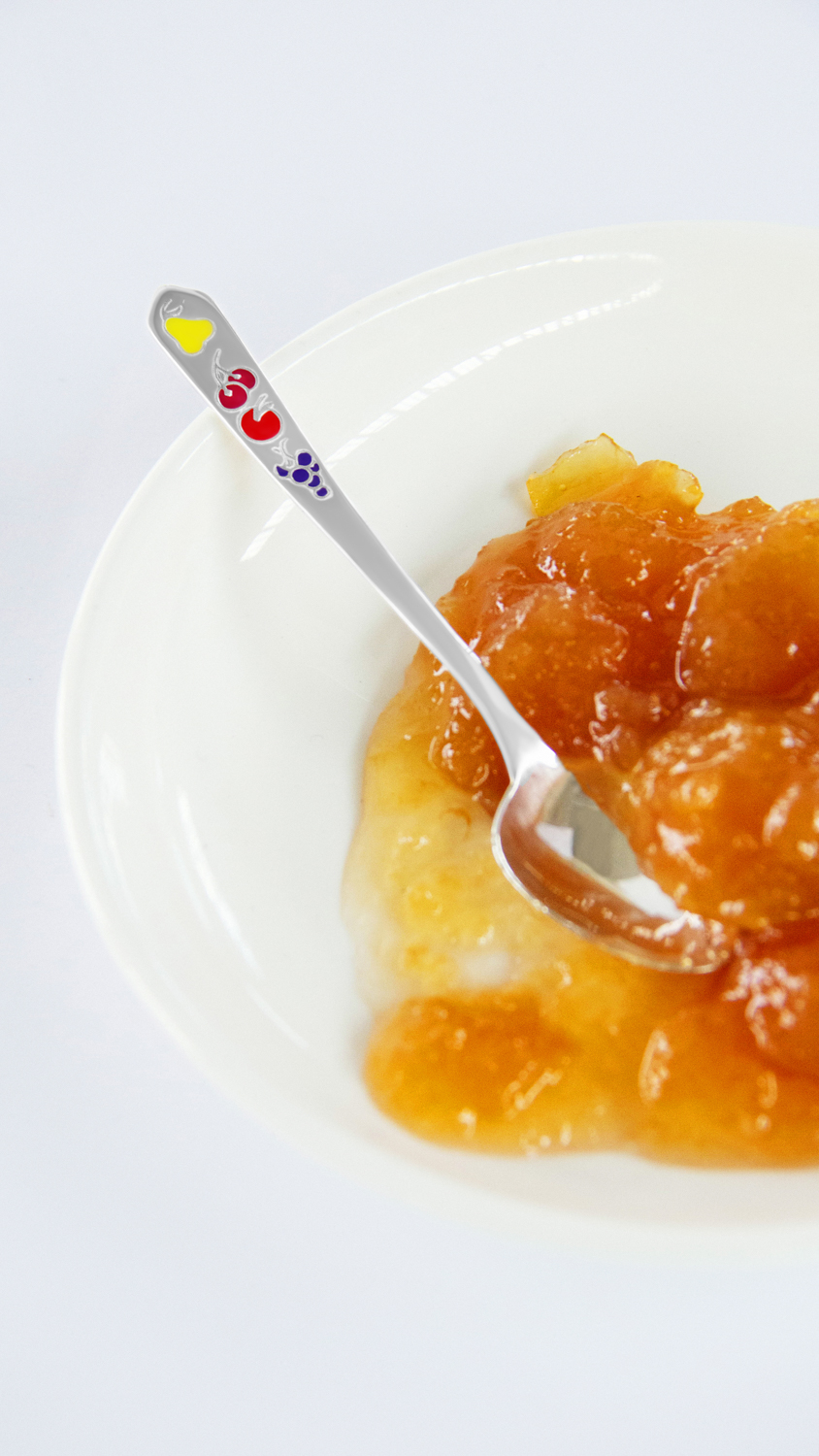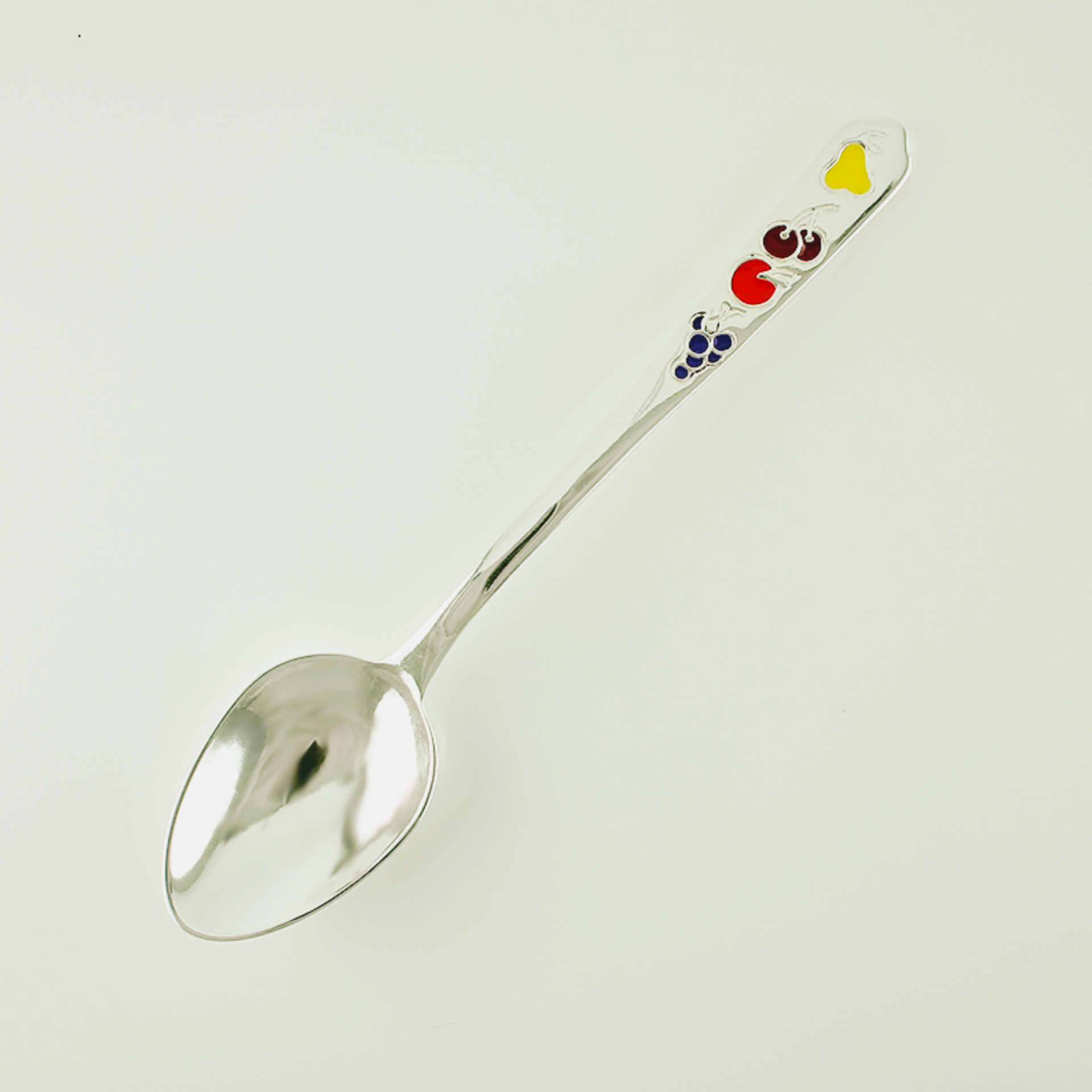 Срібна дитяча ложка з фруктами.